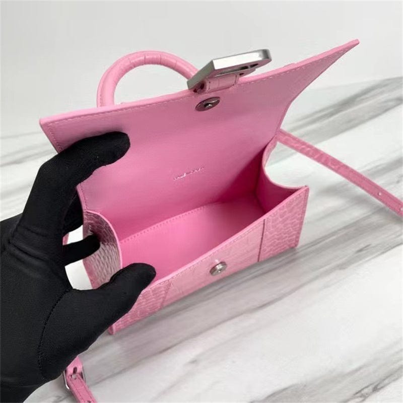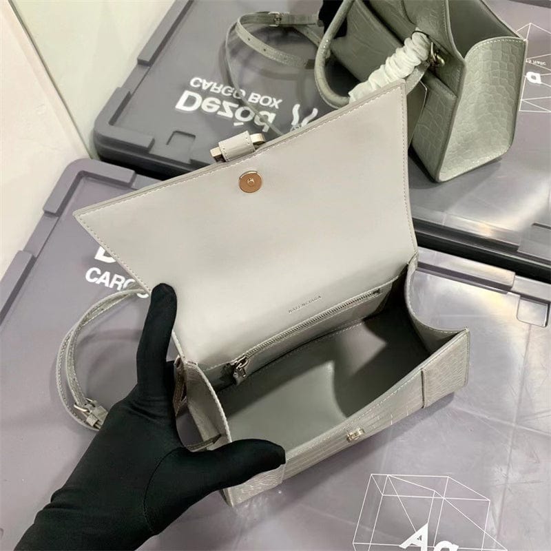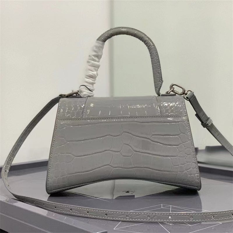 サイズ:横22.9cm x 縦15cm x マチ9.9cmシャイニー クロコダイル型押しカーフスキンハンドバッグ 曲線状の底面ワンハンドル取り外し&調節可能なクロスボディストラップ(54.9cm)スタッド マグネット留めアンティーク調シルバーのB ロゴメタルパーツバックポケット x 1内側ジップ ポケット x 1裏地:ナッパ ラムスキンイタリア製柔らかい布で拭いてください素材: カーフスキン 100%