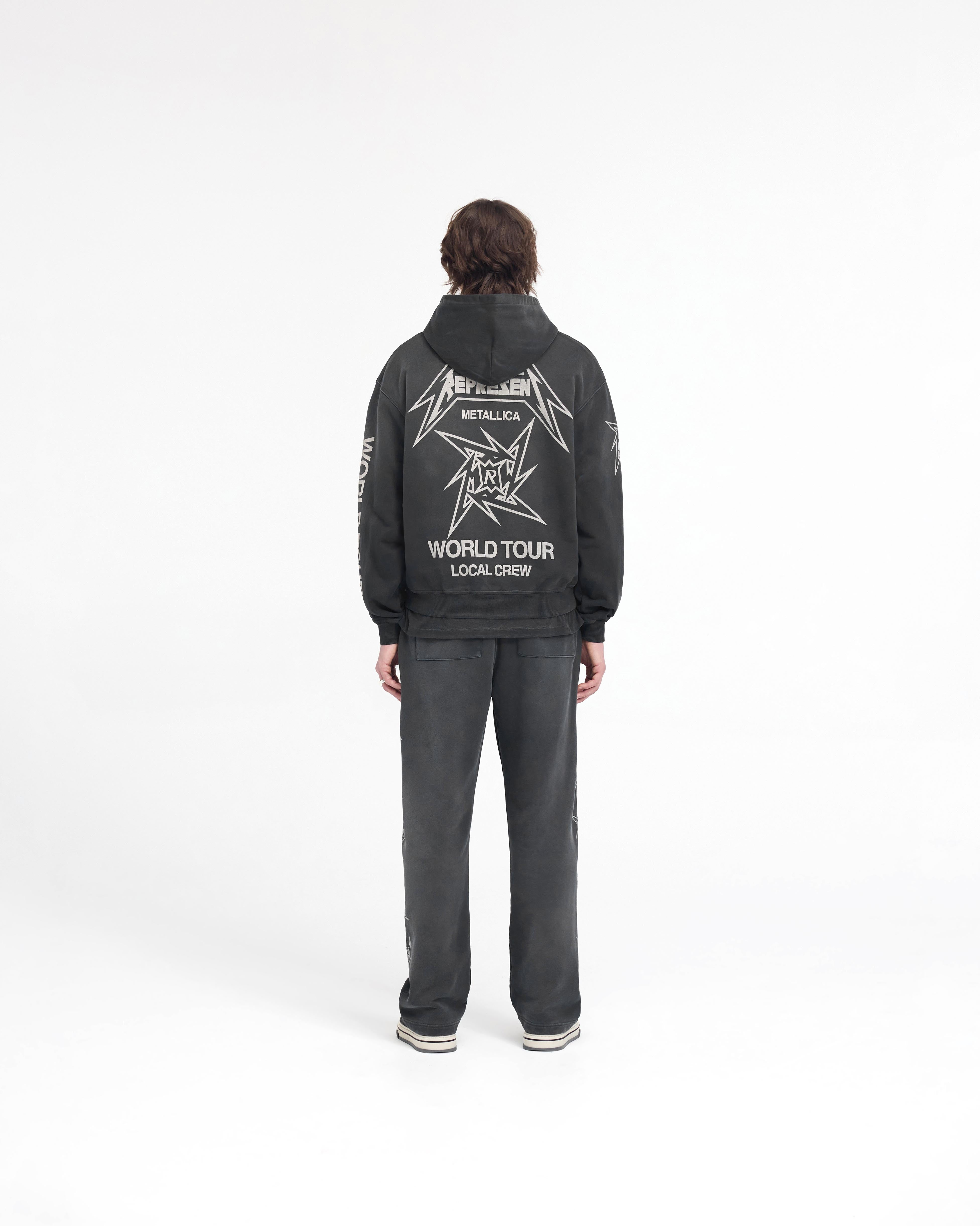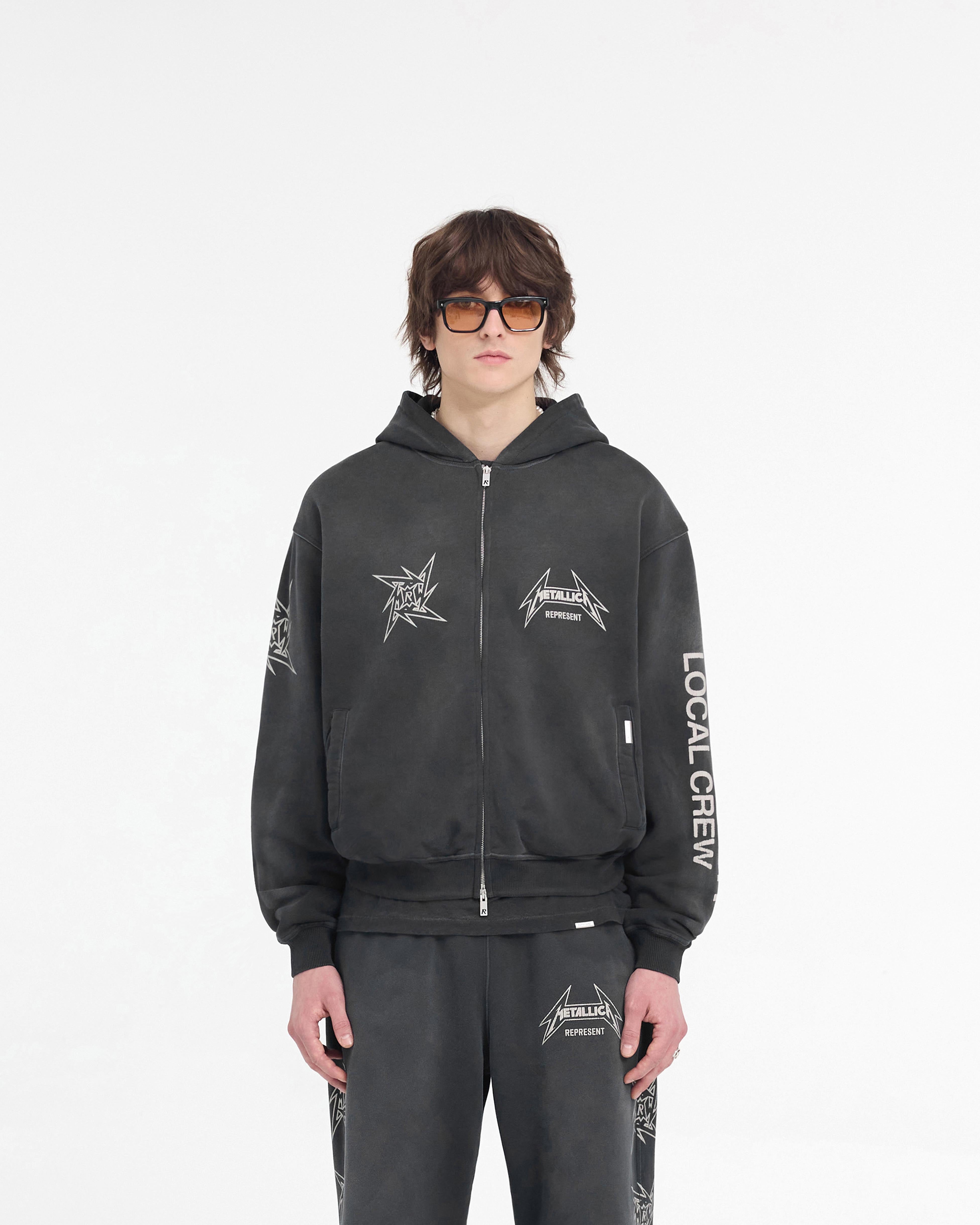Introducing the Metallica Local Crew Zip Hoodie in Stained Black. Designed to channel the spirit of the band’s backstage crew, the hoodie features cracked prints of the ninja star logo, initialised to uphold quintessential Represent branding whilst preserving the aesthetic of the original design.