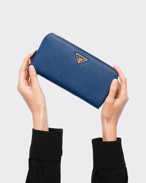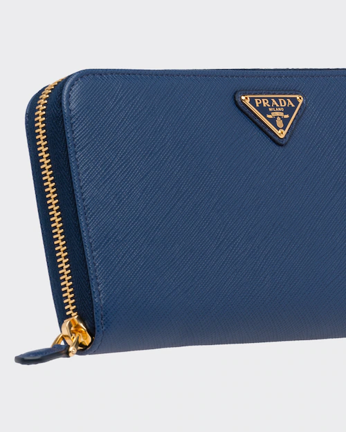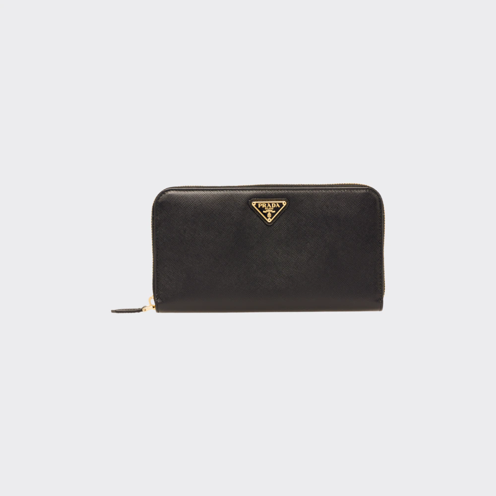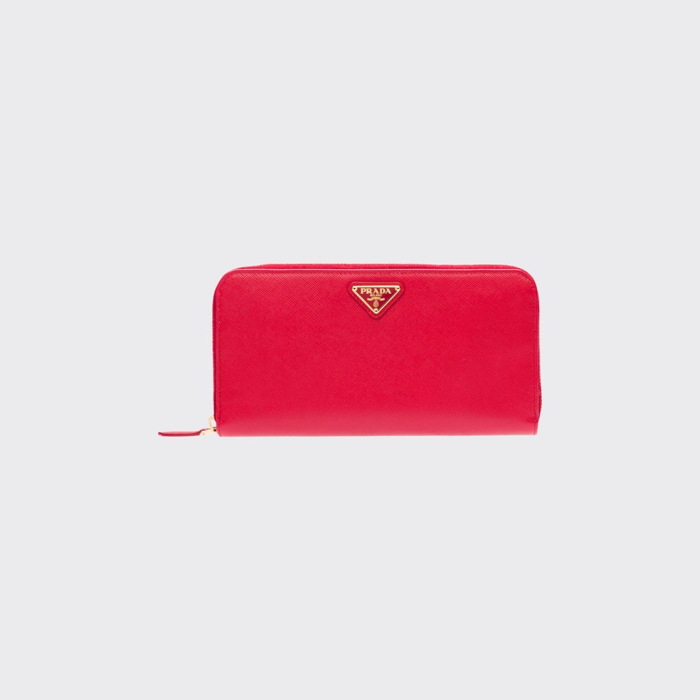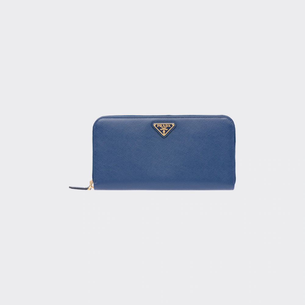 端に丸みのある「サフィアーノ」カーフ牛革財布。ファスナー付札入れ1個 カードホルダー12個 ドキュメントポケット6個 ファスナー付小銭入れ1個。PRADAロゴ入り。ファスナー開閉式。