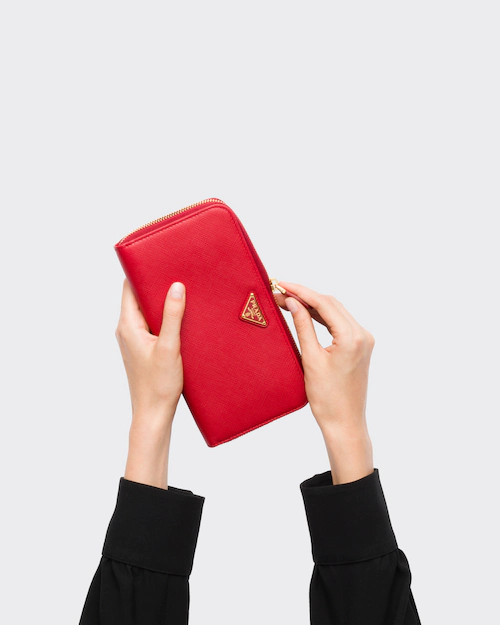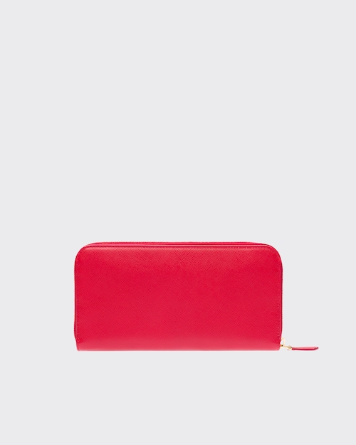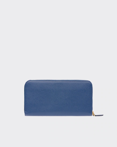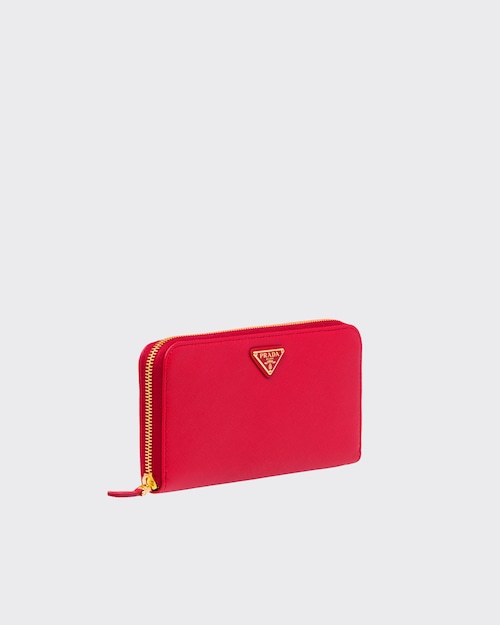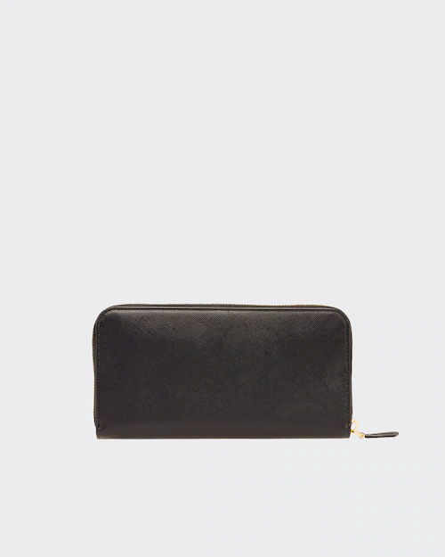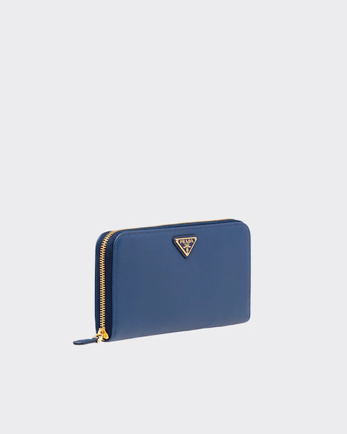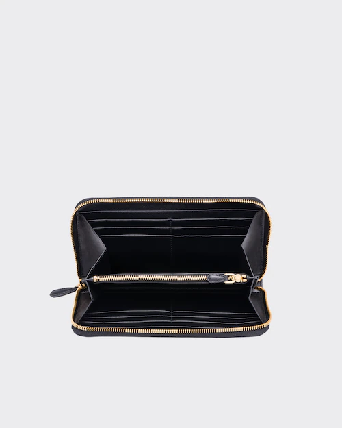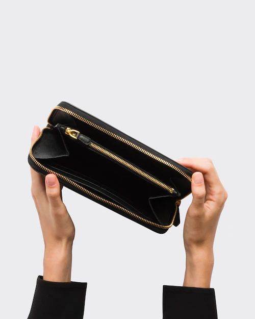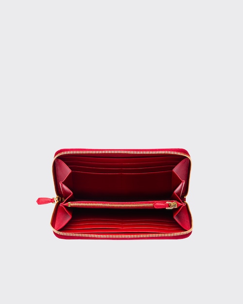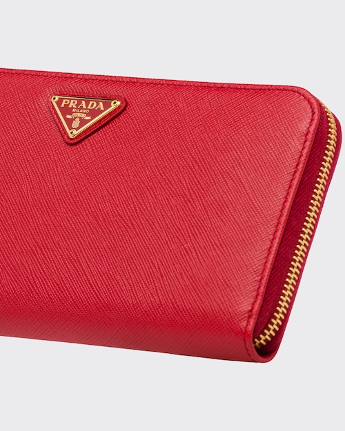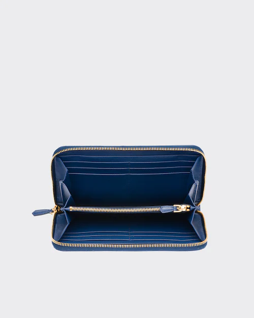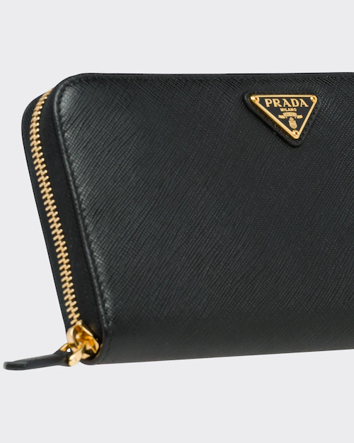端に丸みのある「サフィアーノ」カーフ牛革財布。ファスナー付札入れ1個 カードホルダー12個 ドキュメントポケット6個 ファスナー付小銭入れ1個。PRADAロゴ入り。ファスナー開閉式。
