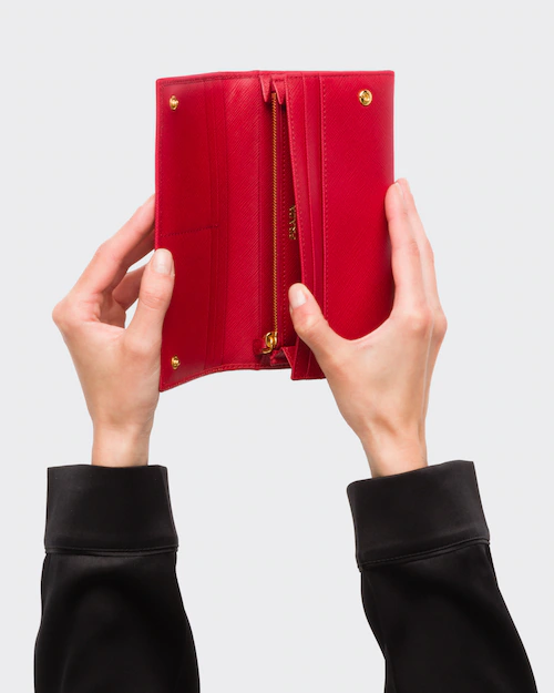 プラダのトライアングルロゴをあしらった 「サフィアーノ」レザー牛革のフラップ付の財布。スナップ開閉式で 内側に複数のポケットと 取り外し可能なチェーン付バッジホルダーを備えたアイテム。