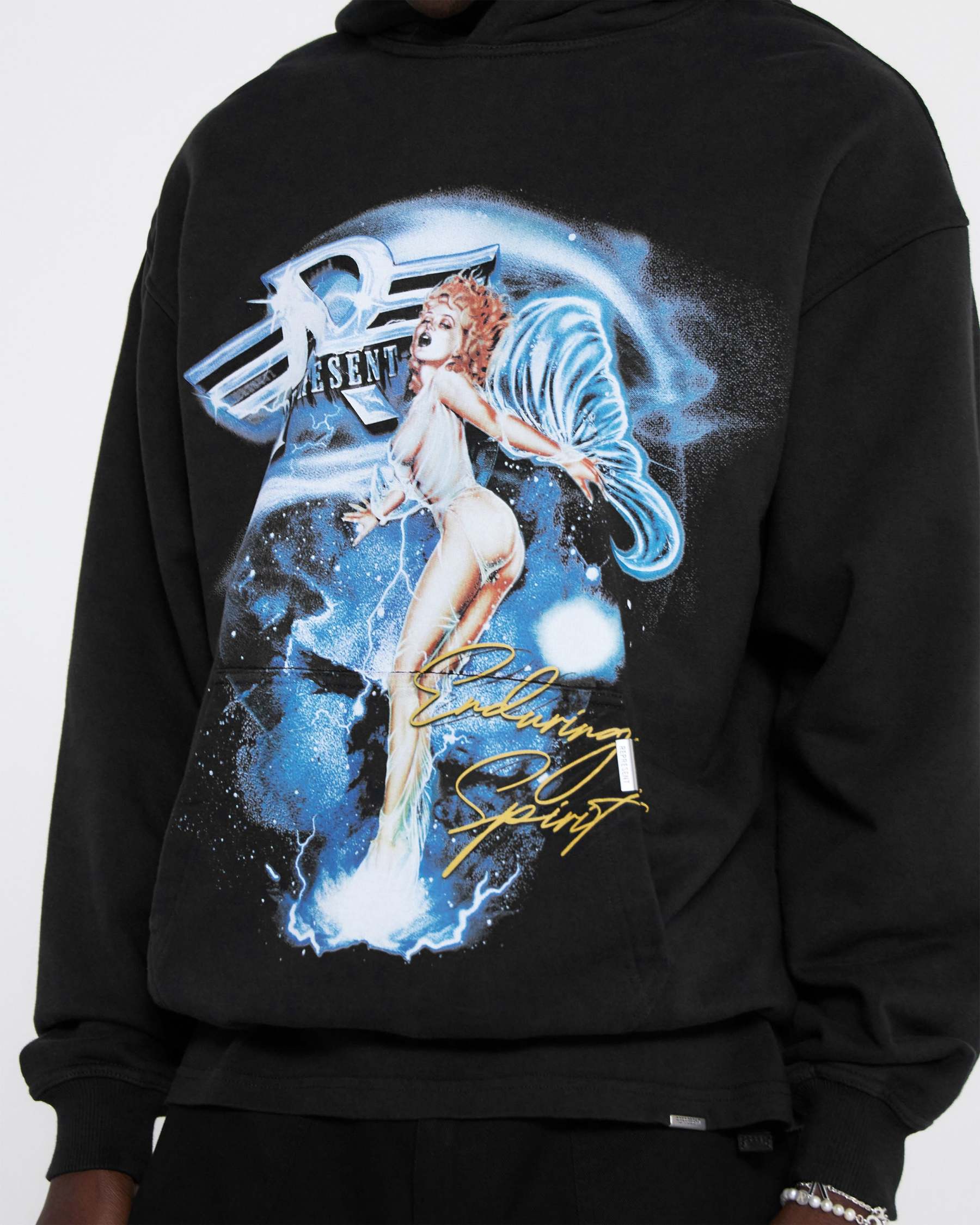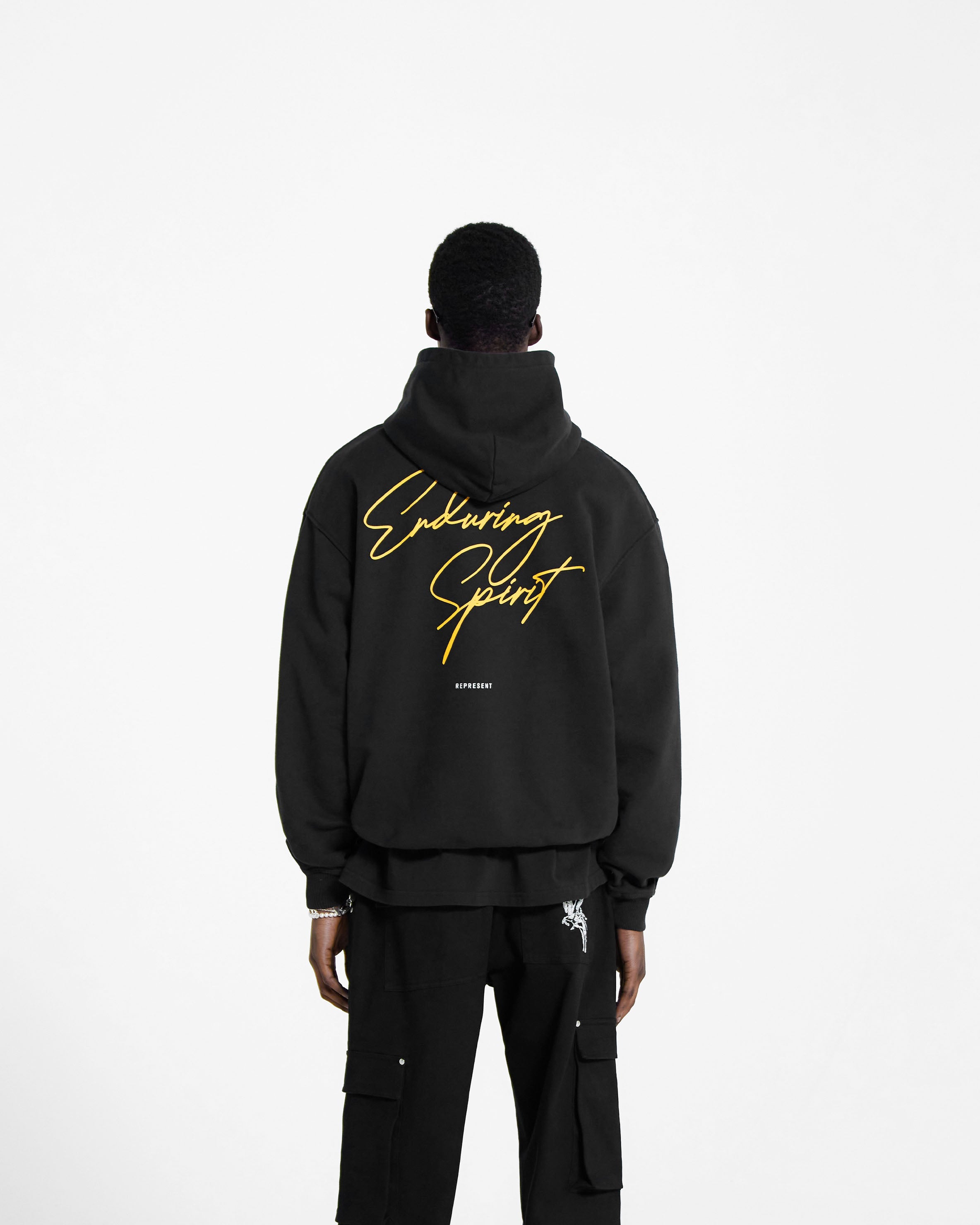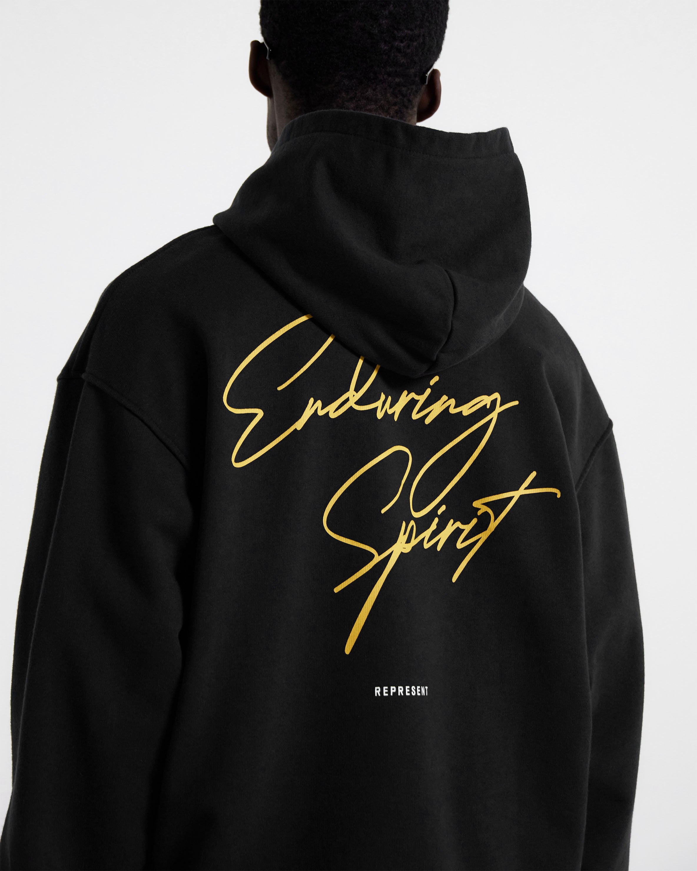 The Enduring Spirit Hoodie in Off Black is crafted from luxury heavyweight cotton, with a slightly oversized fit. It features our Enduring Spirit graphic to the front and motif to the back, with ribbed hems and cuffs. A cobrax popper to the hood and Represent metal bar to the pocket finish the hoodie.