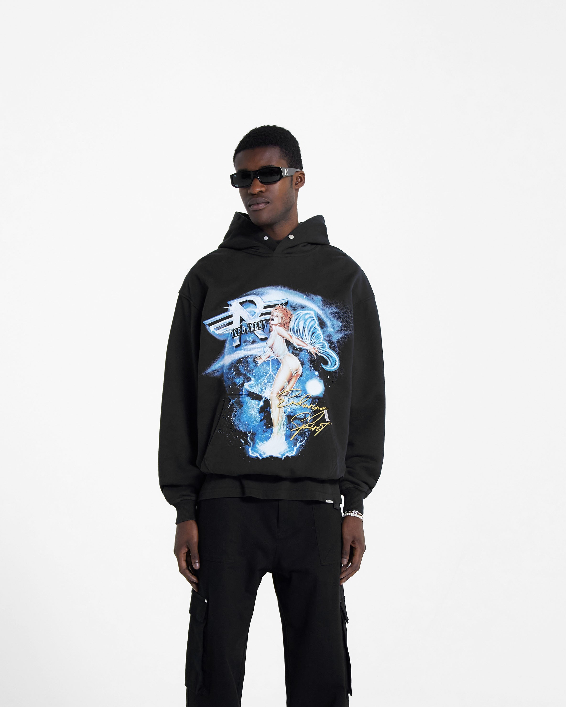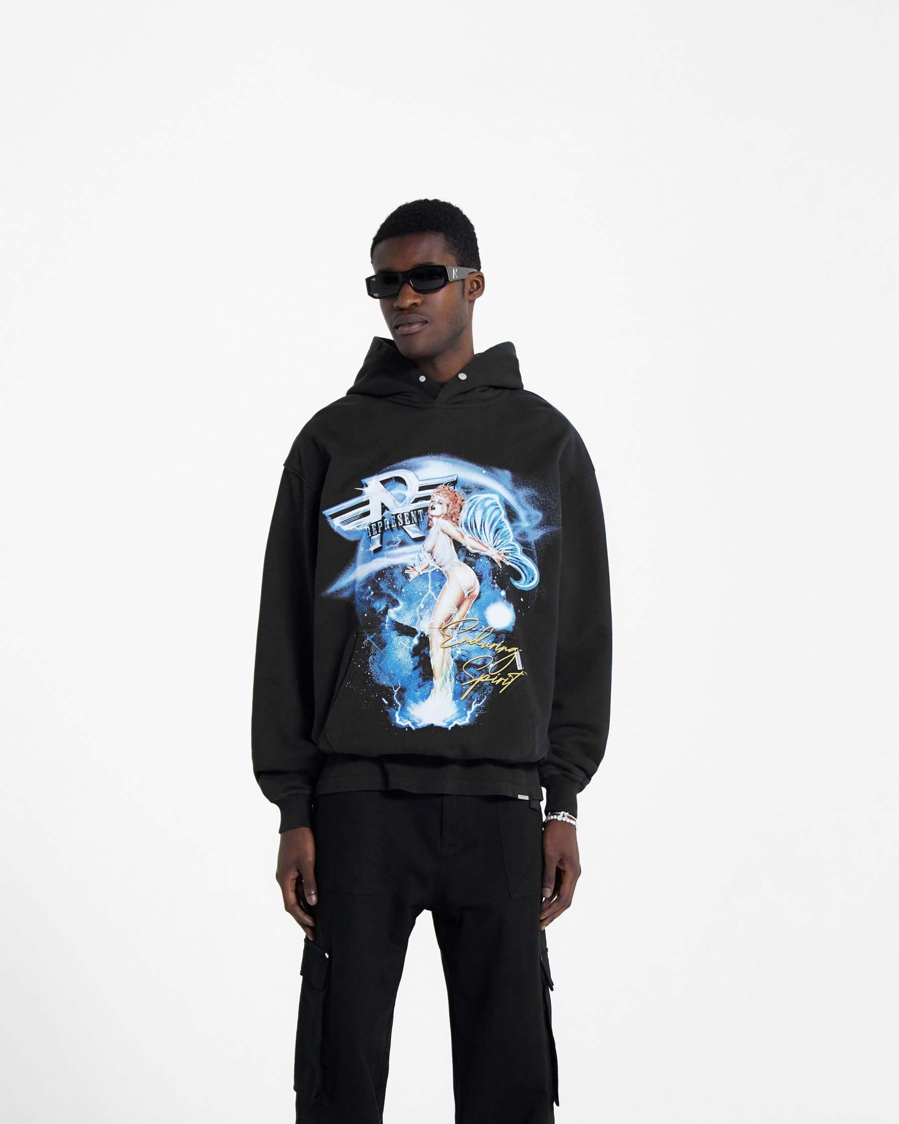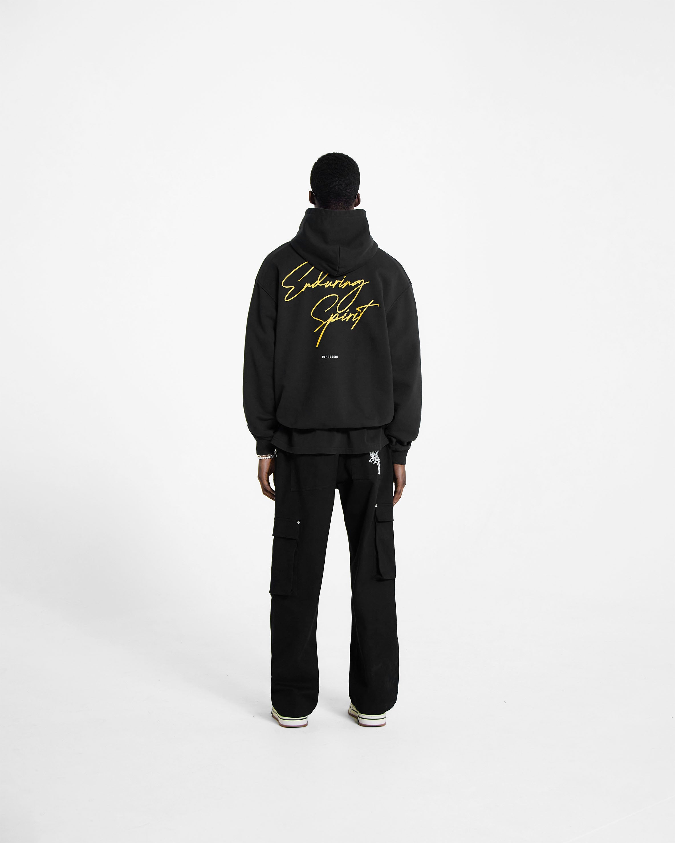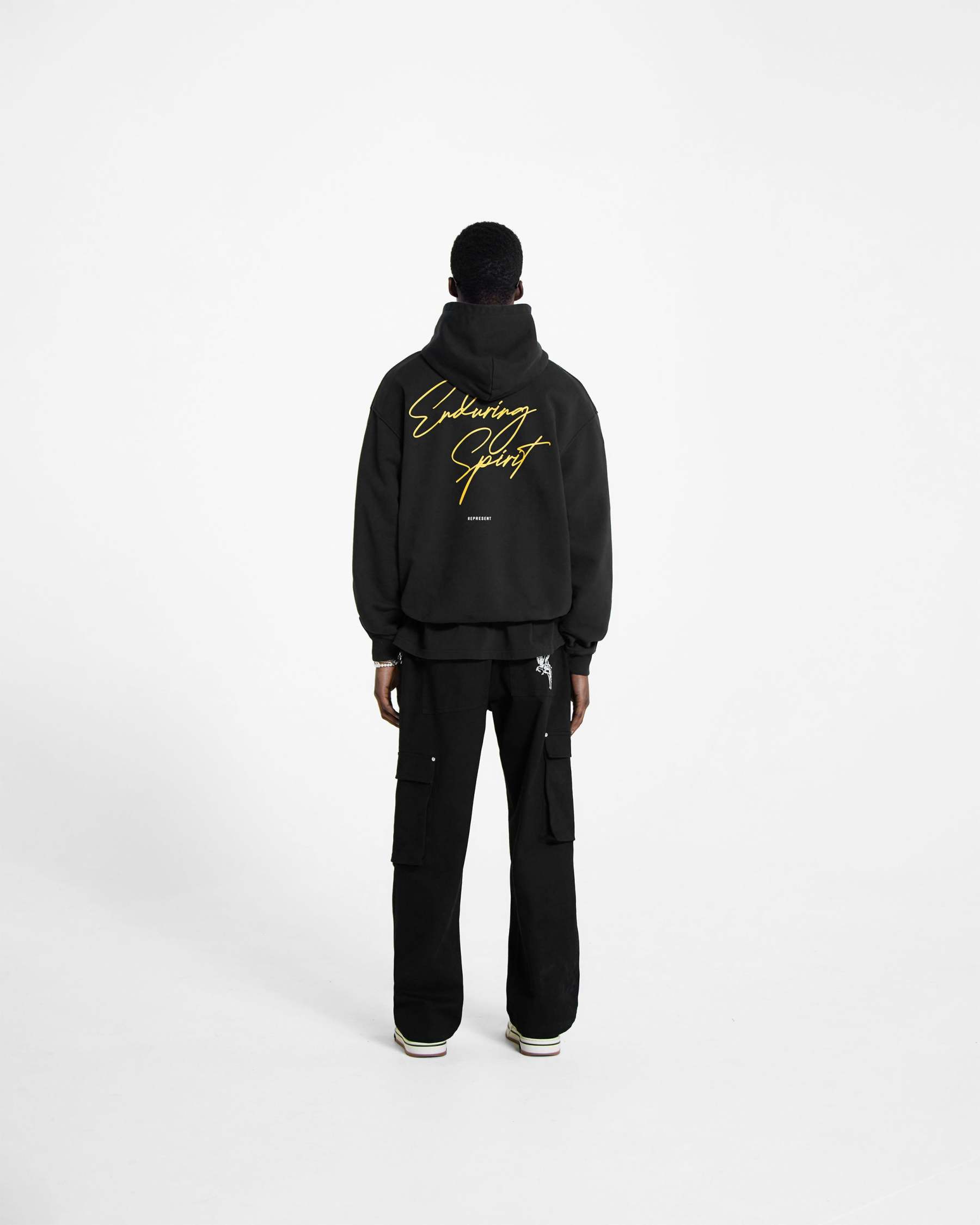 The Enduring Spirit Hoodie in Off Black is crafted from luxury heavyweight cotton, with a slightly oversized fit. It features our Enduring Spirit graphic to the front and motif to the back, with ribbed hems and cuffs. A cobrax popper to the hood and Represent metal bar to the pocket finish the hoodie.