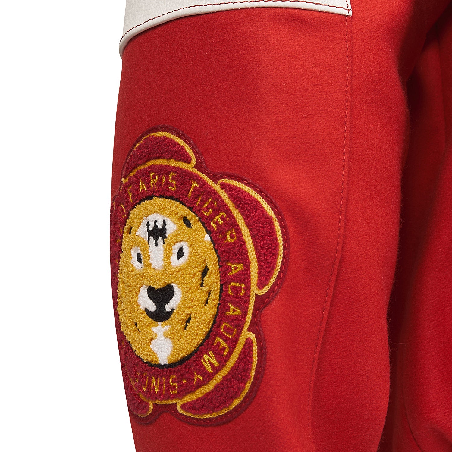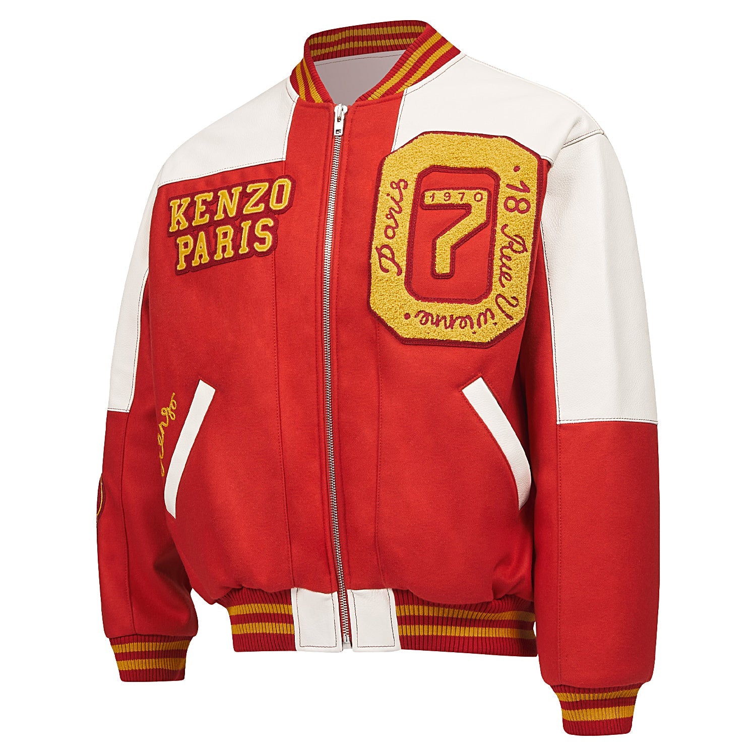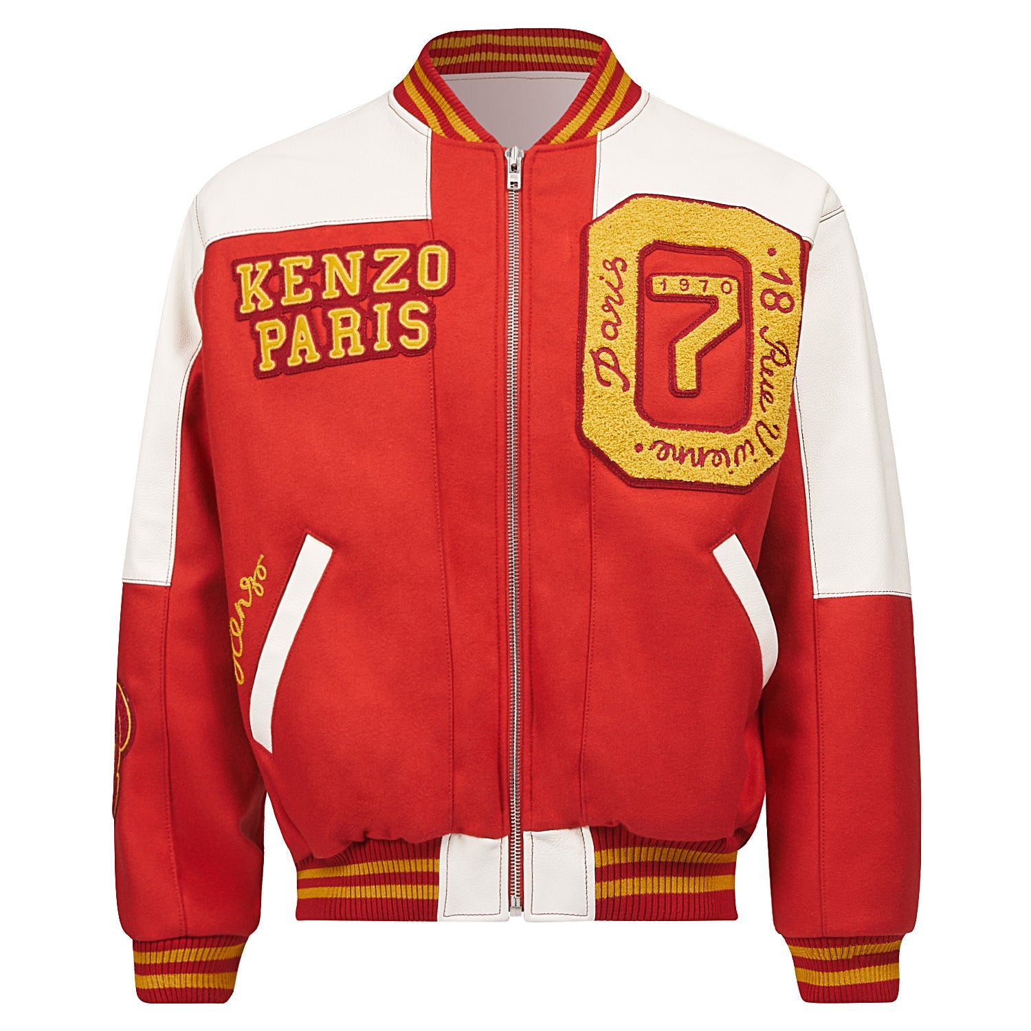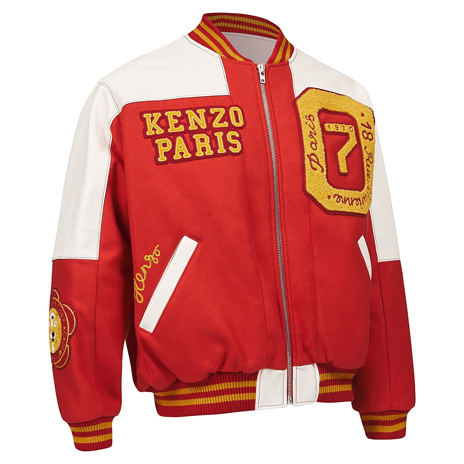 With its nod to Ivy League sportswear style, the Varsity jacket is one of Nigo's latest flagship designs. It is decorated with a 'KENZO Tiger Academy' motif depicting a stylised Tiger surrounded by the petals of the iconic 'BOKE FLOWER.' The chest is decorated with lush terry loop graphics inspired by the House's rich history, such as the 'Rue Vivienne' inscription evoking the first-ever KENZO boutique.