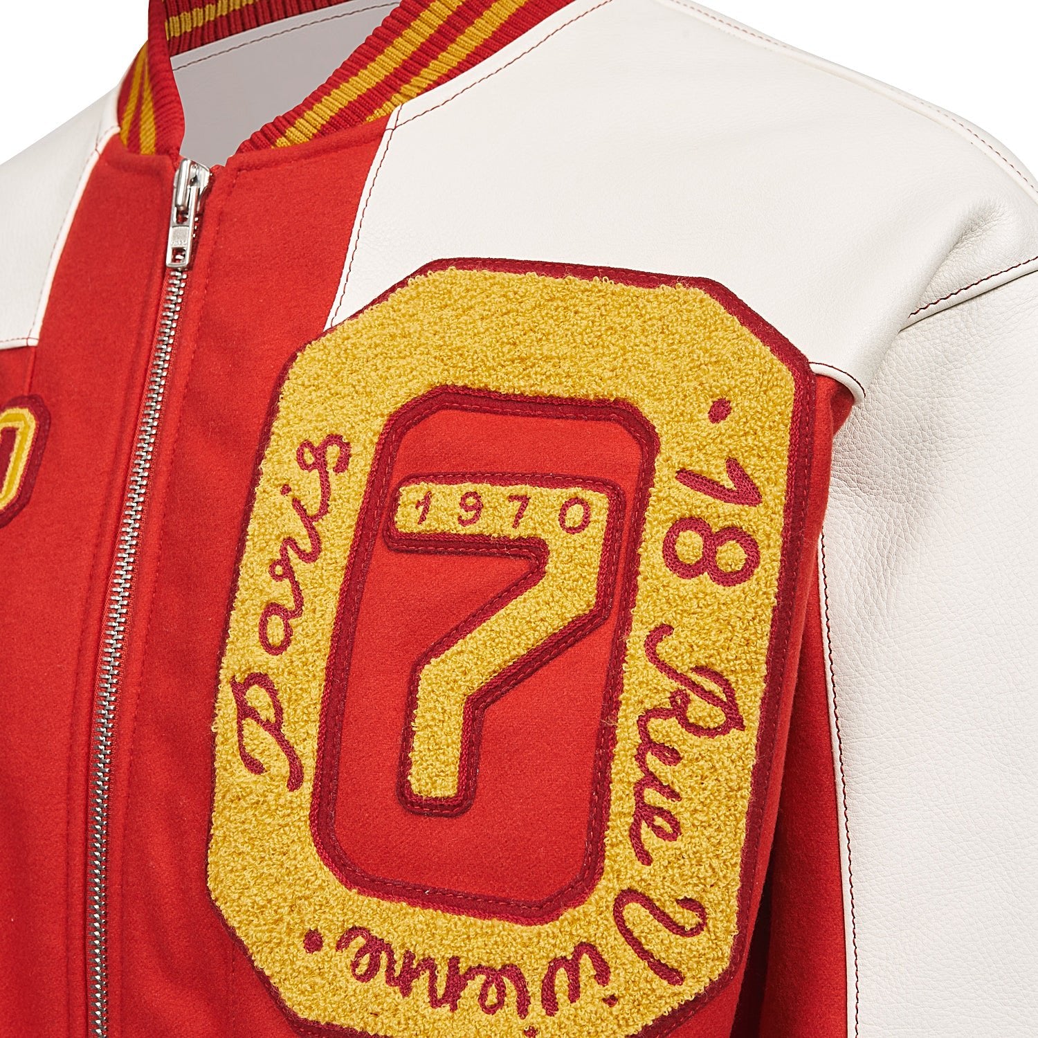Varsity jacket with long wool and leather sleeves.